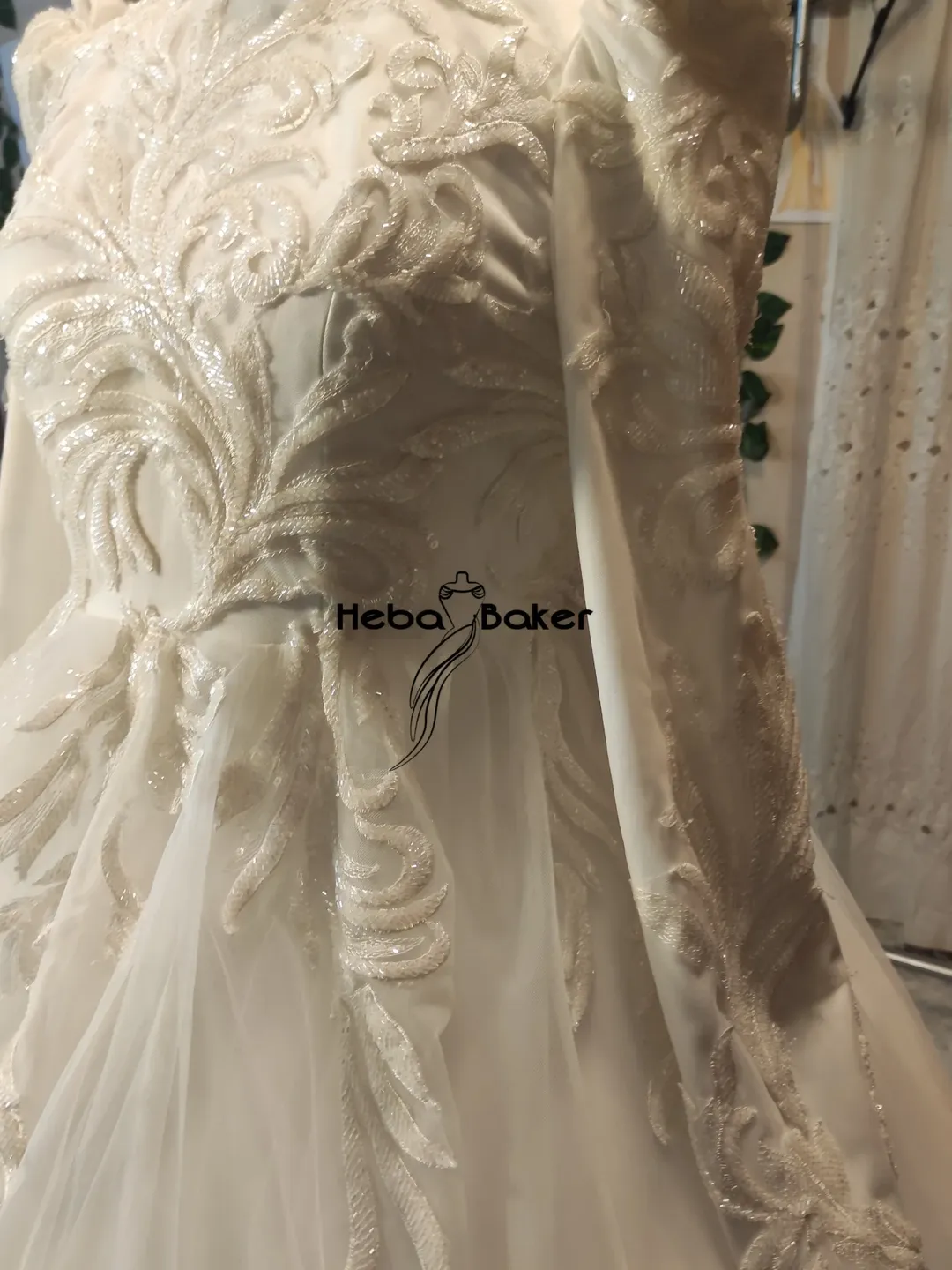 فستان زفاف عاجي مذهل مع تفاصيل دانتيل مخيطة يدوياً وذيل كاتدرائيي.